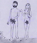 Adam und Eva bedecken ihre Nacktheit mit Feigen-